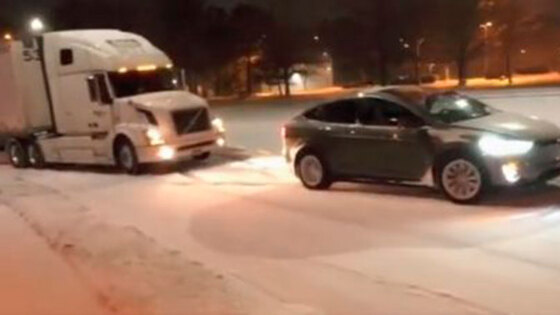 Автомобиль Tesla вытянул из снежного сугроба 40-тонную фуру: видео