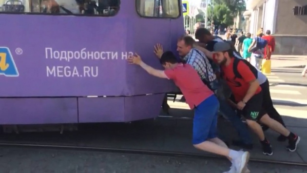 Екатеринбуржцев, которые 16 июля помогли вытолкать трамвай № 6 с поворота около Музкомедии к остановке рядом с Главпочтамтом, хотят наградить за этот поступок. Такое сообщение появилось в группе ТРЦ «Мега» в соцсети «ВКонтакте». На трамвае была размещена реклама торгового центра, видимо, поэтому его представители решили поблагодарить добровольцев за спасение «своего» трамвая. Если вы знаете этих мужчин, то напишите об этом сюда. Запись того, как горожане помогают общественному транспорту, сделали очевидцы и поделились ею с E1.RU. На ней видно, как толпа добровольцев несколько метров толкает трамвай, который по каким-то причинам остановился. «Запустить» его получилось очень быстро, и он продолжил свой путь по маршруту. В марте горожане сами вытолкали легковушку, которая застряла на путях и мешала проехать трамваю на Малышева.