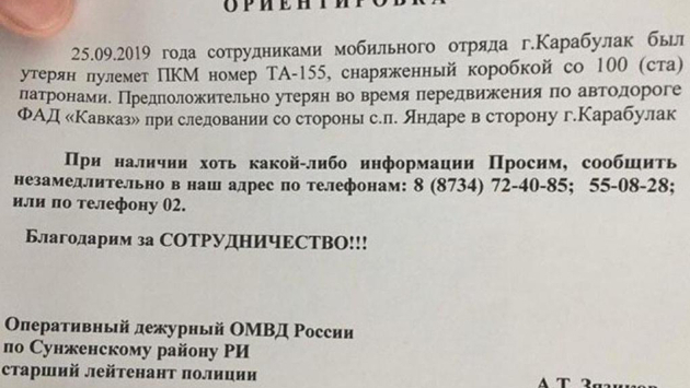По данным источников, которые приводит издание, пулемет калибра 7,62 миллиметра с металлической коробкой, снаряженной 100 патронами, был потерян силовиками либо вечером 25 сентября, либо утром 26 сентября во время движения на грузовике КАМАЗ на участке федеральной трассы «Кавказ» по пути из села Яндаре в Карабулак.