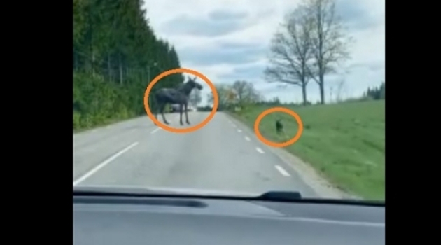Лосиха переводила детеныша через дорогу в Нижегородской области