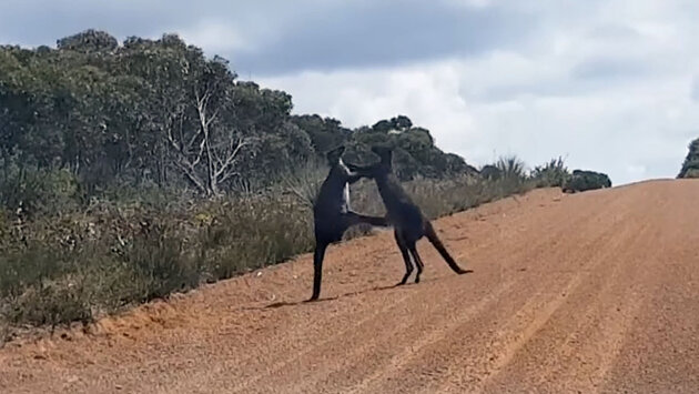 Водитель на проселочной дороге в Австралии снял на видео преградившую ему путь пару кенгуру, которые решили выяснить отношения прямо посреди проезжей части. Запись была сделана Марком Мэлоуном на острове Кенгуру неподалеку от южного побережья Австралии 29 сентября. В течение нескольких минут сумчатые бойцы поочередно наносили друг другу удары лапами и толкались, после чего переместились на обочину дороги, позволив наконец водителям проехать. Ранее сообщалось, что в Австралии чуть не попала под машину пара подравшихся прямо посреди дороги коал.