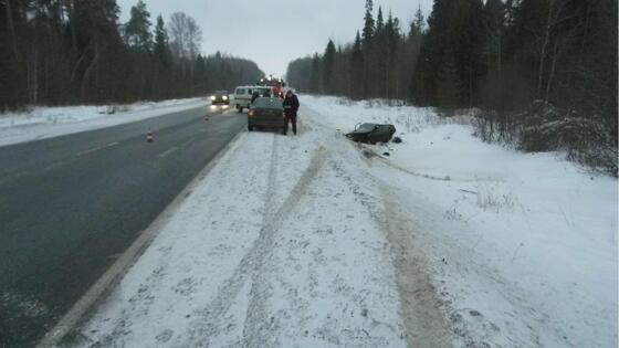 ДТП произошло в 14 часов 03.01.2018 года. На 137 километре федеральной автодороги «Вятка», по предварительным данным, 34-летняя женщина-водитель автомобиля «Хендай-Солярис» в сложных дорожных условиях совершила съезд с дороги с последующим опрокидыванием. В результате происшествия два пассажира автомобиля «Хендай-Солярис» получили травмы: 41-летний мужчина и 11-летний мальчик. Госпитализация им не потребовалась. Фото – gtrk-vyatka.ru