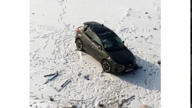 Авария прозошла сегодня днем. По словам пользователей «ВКонтакте», мужчина за рулем иномарки хотел обогнать идущий впереди КамАЗ, но увидел встречную машину. Чтобы избежать столкновения, ему перед мостом ему пришлось влево. В результате Mazda оказалась на льду Тобола. Напомним, сегодня в Кургане маршрутный автобус снес дорожный знак и врезался в дерево. Фото: vk.com/puvkgn