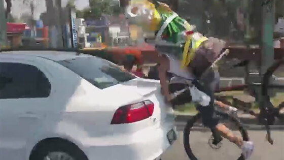 Велосипедист с Иудой за спиной врезался в машину на полном ходу: видео