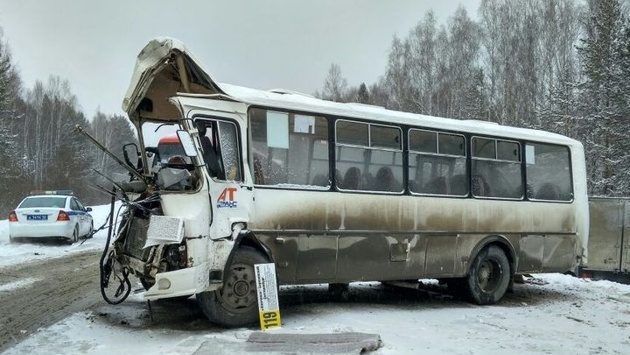 Погиб мужчина. Вечером 22 марта на 26-м километре трассы Екатеринбург - Реж - Алапаевск лоб в лоб столкнулись автобус ПАЗ и грузовик Mitsubishi Fuso. Как рассказали "Уралинформбюро" в отделении пропаганды свердловского УГИБДД, на встречную полосу при обгоне выехал водитель автобуса (маршрут №119 "Ключевск-Березовский-Екатеринбург"). Он скончался на месте. Травмы получила женщина-кондуктор. В момент аварии в салоне находились 5 пассажиров. Они не пострадали. Из-за ДТП на трассе скопилась большая пробка. На месте работают сотрудники ГИБДД.