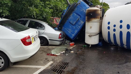 «В районе д. 30 по ул. Полбина бетономешалка врезалась в припаркованные автомобили и после этого перевернулась», — сказал источник.