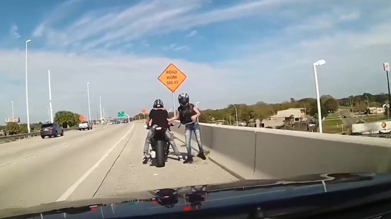 Дорожно-транспортное происшествие с летальным исходом, произошедшее в минувшую пятницу, 15 февраля, в округе Хилсборо, расположенном в штате Флорида на юго-востоке США попало в объектив регистратора. Пара байкеров обогнала автомобиль, из которого велась съемка. Мотоциклист, ехавший первым, перестроился в правый ряд и начал сбрасывать скорость. Водитель второго двухколесного транспортного средства, двигавшийся следом, повторил маневр, однако он тормозил менее интенсивно. Мотоциклисты столкнулись и один из них потерял равновесие, после чего врезался в ограждение и перевалился через него, рухнув с 30-метровой эстакады, где и происходили описываемые события. Как сообщают местные СМИ, 35-летний Эрик Джордан скончался от полученных травм. Второй участник ДТП скрылся, оставив на месте аварии пассажира. Полиции удалось установить личность байкера, однако искать его не потребовалось, так как он сам связался с правоохранительными органами. Известно, что до окончания расследования, ведущегося в настоящее время, никаких обвинений предъявлено не будет.