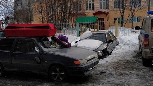 МУРМАНСК, 2 апр – РИА Новости. Прохожие в Мурманске вызвали полицию после того, как увидели на одной из улиц города легковой автомобиль с установленным на крыше гробом, проводится проверка, сообщили РИА Новости в пресс-службе регионального УМВД. "В полицию позвонили очевидцы, сообщили о том, что на улице Гвардейской стоит автомобиль с гробом на крыше. На место выехал наряд полиции, проводится проверка", - сообщили в пресс-службе. Фотографии автомобиля появились в социальных сетях. На них видно, что красный гроб установлен на крышу автомобиля ВАЗ. Кроме того, на лобовом стекле лежат траурные венки. Судя по фото, колеса автомобиля проколоты. В соцсетях пользователи рассказывают о том, что видели микроавтобус, из которого выгружали гроб. Многие предположили, что эта акция – дело рук коллекторов. Однако как сообщил РИА Новости источник в экстренных службах, к деятельности коллекторов этот случай не имеет отношения.