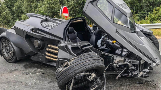 Реплика «бэтмобиля» с мотором Lamborghini попала в аварию на трассе в районе Тетегем во Франции – она столкнулся с Renault Scenic. Оба автомобиля серьезно пострадали, зато водители отделались только испугом и синяками.
