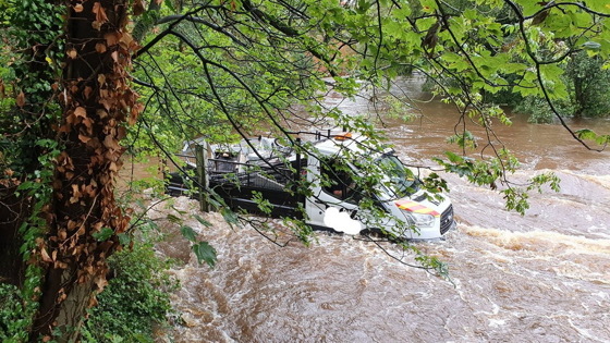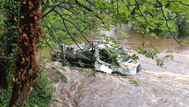 Коммунальщики из английского города Рипон оказались заблокированы в служебном автомобиле, после того как водитель решил срезать дорогу по спутниковому навигатору. Из-за дождей река вышла из берегов, и неглубокий брод превратился в непроходимый участок дороги — бортовой Ford Transit заглох, а очевидцам пришлось вызывать спасателей.