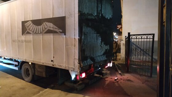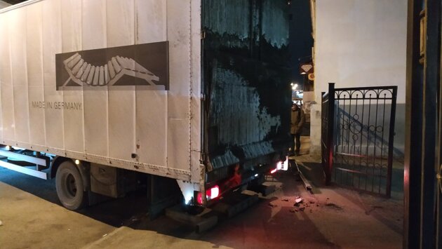 Иногородний грузовик снес ворота у лицея на улице Пискунова