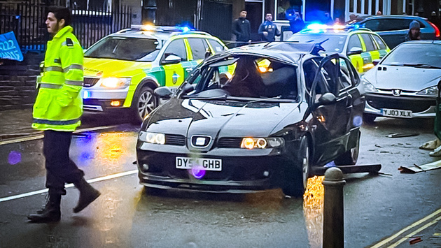 Очевидец, который сидел в ближайшем баре, написал в Twitter об "оглушительном взрыве" и поделился снимками с места происшествия, на которых виден покореженный хэчтбек.