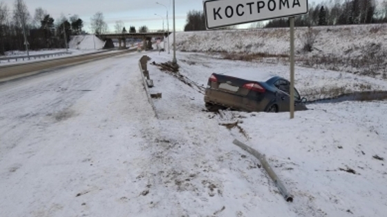 Иномарка улетела в кювет и снесла знак «Кострома»