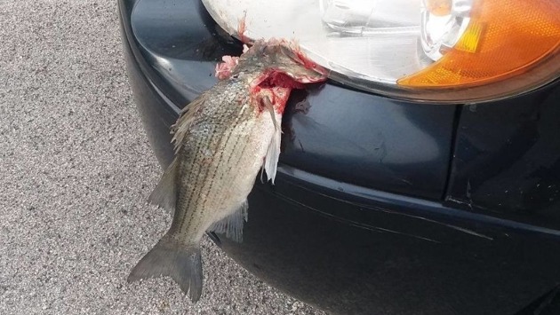 В штате Теннеси, США, на автомобиль, двигавшийся по трассе, упала рыба и устроила ДТП. В результате столкновения окунь застрял между передним бампером и фарой.