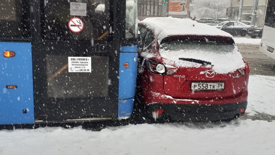 В Калининграде в субботу, 30 января,на Ленинском проспекте произошло ДТП с участием рейсового автобуса №103 и внедорожника «Мазда CX5». Пассажирский автобус следовал по маршруту Калининград - Гурьевск – Константиновка. Об этом сообщают очевидцы из сообщества автомобилистов Калининградской области. Авария произошла около 12 дня у ТЦ «Плаза»: В середине дня Калининград из-за снегопада и нескольких ДТП встал в восьмибальных пробках. Ранее kaskad.tv писал о том, что 29 января за сутки в Калининградской области произошло 52 ДТП.