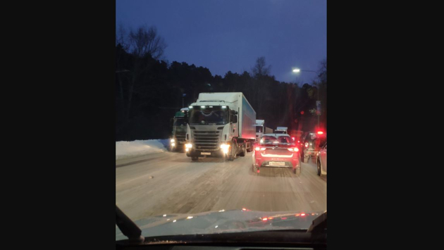 Утром в кузбасской столице оказался заблокирован проезд по шоссе. Причиной произошедшего стали остановившиеся фуры.