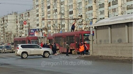В Казани пассажирам пришлось толкать трамвай