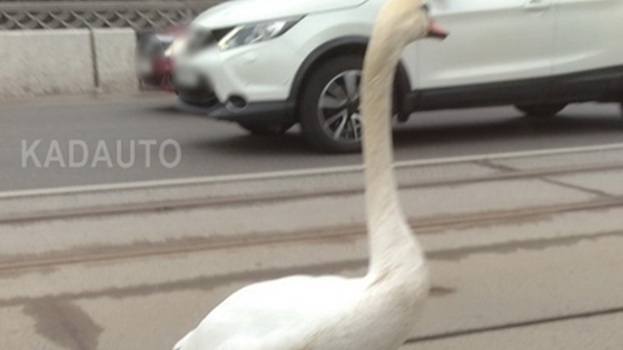В Калининграде по эстакадному мосту вновь прогулялся лебедь