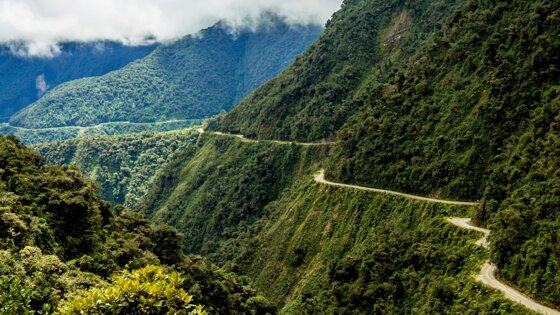 Камино-Лос-Юнгас, Боливия. Данная дорога была построена в 30-х годах XX века и известна как самая опасная трасса в мире. Это узкий и извилистый серпантин с одной стороны которой обрыв, а с другой крутые годы. Да, данной трассе часто сходят обвалы и оползни. Чтобы проехать данную дорогу, следует быть предельно внимательным, иначе на крутом повороте можно слететь в обрыв, особенно она опасна во время тумана и дождей.