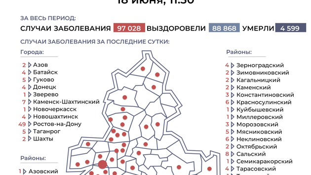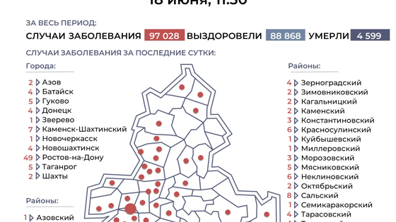 Ростовская область, 18 июня 2021. В Ростовской области за сутки новых зараженных коронавирусом выявили в 37 городах и районах. Суточные данные обновил региональный оперштаб. По количеству новых зафиксированных случаев заражения лидирует Ростов - 49 человек, за ним идет Сальский район - 8 человек и Каменск-Шахтинский - 7 человек. В остальных муниципалитетах от выявили от 6 до 1 случая заражения. Напомним, за минувшие сутки в Ростовской области зафиксировали 156 новых зараженных и 202 выздоровевших. Общее количество инфицированных в регионе с начала пандемии 97 028 человек, а выздоровевших - 88 868 человек. Кроме того, прививку за сутки сделали 7 004 человека, а второй компонент вакцины получили еще 6002 жителя. Общее количество вакцинировавшихся на данный момент составляет 523 509 человек, а тех, кому вакцину ввели двукратно - 426 732 жителя.