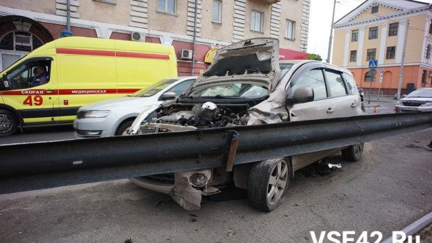 Ранее мы писали, что автомобиль въехал в отбойник у трамвайной остановки в Кемерове. Читатель поделился с редакцией фотографиями с места аварии.
