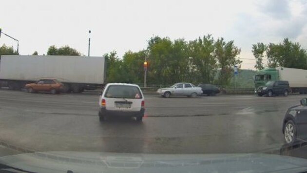 Возможно, именно это и сбило с толку автомобилиста. Как только фура начала движение, водитель Nissan выехал на трассу. Красный все еще горел.