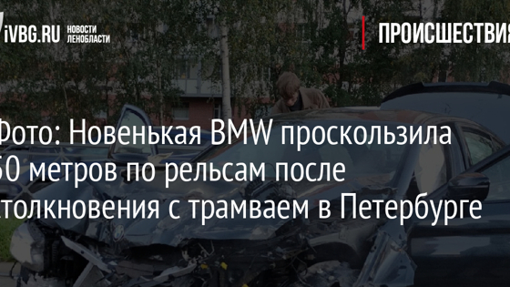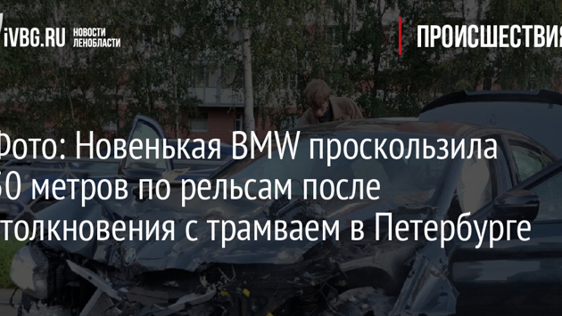 Фото: Новенькая BMW проскользила 50 метров по рельсам после столкновения с трамваем в Петербурге