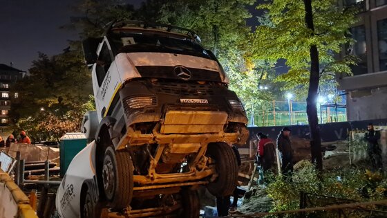 Бетономешалка провалилась в котлован на Звенигородском шоссе в Москве. Фото с места происшествия опубликованы агентством «Москва».