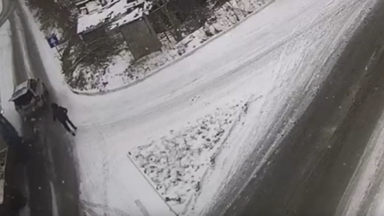 У машины стоял ее владелец: мужчина что-то делал в багажнике и в последние секунды успел отскочить. От столкновения машина покатилась вперед по улице, а мужчина поторопился ее догнать.