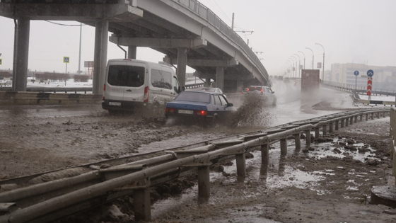 Речь идет о Кузнецком мосте, соединяющем Центральный и Рудничный районы города. Недалеко от трамвайной переправы из-за стаявшего снега образовалась лужа, которая заняла сразу несколько полос движения.