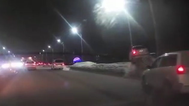 Поздно вечером белый седан ехал по Октябрьскому мосту в направлении к правому берегу. В какой-то момент водитель не поделил дорогу с универсалом, ехавшим справа.