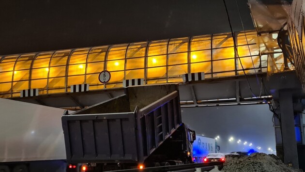 Владимирская область, ноябрь прошлого года. Не смогли разъехаться большегруз и надземный переход, водитель не рассчитал габариты. Похожий случай и в Екатеринбурге, но страшнее. Ночь, грузовик и падающий мост.