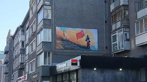 В Новосибирске на фасаде одного из домов на Красном проспекте появился баннер с изображением украинской бабушки с красным знаменем Победы. Банер сделала новосибирская художница Анастасия Хнюнина.
