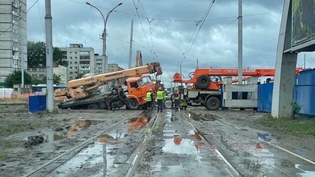 В Новосибирске автокран провалился в грунт и перекрыл дорогу трамваям