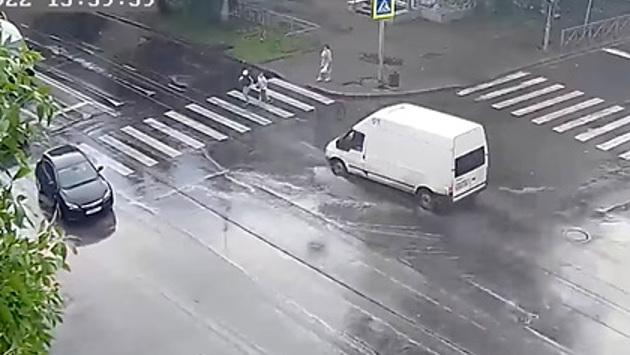 На кадрах видно, как подростки перебегают оживленный перекресток, который не регулируется светофорами. На них на полной скорости едет фургон — водитель начинает резко тормозить незадолго до перехода, но ему не удается избежать наезда.
