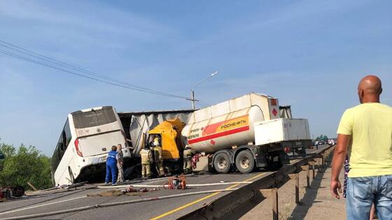 РЕН ТВ со ссылкой на источник. По словам источника, в результате инцидента погиб водитель большегруза. Кроме того, 15 человек получили «легкие травмы». Очевидец происшествия рассказал, что грузовик столкнулся с газовозом на встречной полосе. Водитель автобуса, который следовал за большегрузом, успел вывернуть руль и въехал в отбойники,