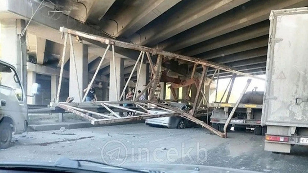 Авария произошла на Объездной дороге в Екатеринбурге: металлическая конструкция, которую вез грузовик, зацепилась за мост и рухнула на легковой автомобиль. Его пассажиров пришлось доставать с помощью специального оборудования, сообщает «КП-Екатеринбург». В результате ДТП в больницу попали двое детей 8 и 14 лет и двое взрослых. Спасатели добавили, что только чудом обошлось без жертв. Для предотвращения возгорания сотрудники МЧС отключили аккумуляторные батареи в автомобилях, а также смыли горюче-смазочные материалы с проезжей части. Инспекторы ГИБДД выясняют обстоятельства аварии..