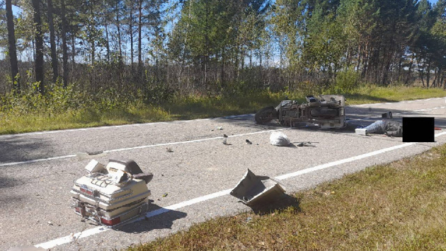 На кадрах с места трагедии можно увидеть перевёрнутый мотоцикл, валяющиеся на пустой дороге детали, вещи водителя. Тело мужчины лежит на асфальте.