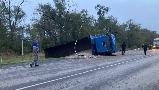 По предварительным данным, 31-летний водитель проезжал Т-образный перекресток на 201 км дороги и не справился с управлением. Большегруз съехал в кювет и перевернулся.