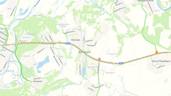 Такая ситуация на дорогах весьма нетипична для вечера выходного дня – полоса дороги отмечена на «Яндекс. Картах» красным цветом.