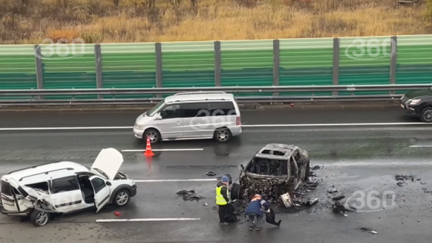 Автомобиль Porsche загорелся после столкновения с «Ладой» на трассе М‑1