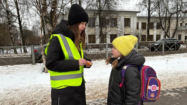 Юные инспекторы дорожного движения напоминали пешеходам всех возрастов, что самый простой способ стать заметным на дороге — это использовать световозвращающие элементы. После беседы инспекторы вручали световозвращающие элементы в виде сердечек.