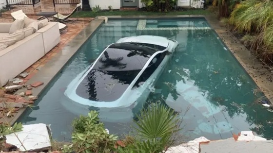 На днях в США, штат Калифорния, произошла странная авария. Владелица электромобиля Tesla перепутала педали тормоза и газа и угодила в собственный бассейн.