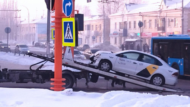 Кроме того, очевидец поделился фотографиями с места ДТП. На них виден результат столкновения: у такси разбит бампер и помят капот, автомобиль увозят на эвакуаторе.