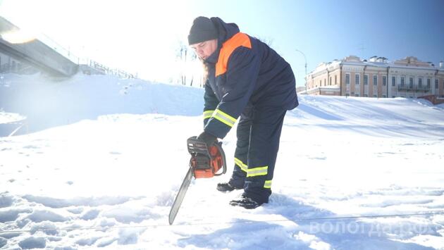 Работу выполняют спасатели Центра гражданской защиты г. Вологды. Сначала они пилят лед с помощью специальной установки и бензопил, после чего посыпают золой. Как поясняют, черный цвет эффективно поглощает солнечные лучи, за счет чего снег тает быстрее.
