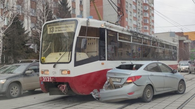 В Новосибирске трамвай №13 столкнулся с Hyundai Solaris
