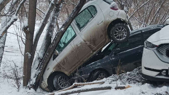 В черте города произошло серьезное ДТП с участием нескольких автомобилей, сообщает группа "Барнаул 22" во "Вконтакте". О дорожной аварии стало известно еще накануне. На спуске по Канатному проезду в южной части Барнаула столкнулись не менее двух автомобилей. При этом на видео с места событий видно, что поблизости находятся минимум пять легковых машин, водители каждой из которых были вынуждены завершить поездку. Вероятно, сначала в кювет съехали автомобили, остановившиеся лишь при наезде на дерево и друг на друга. Одна из машин оказалась в результате столкновения прямо на крыше другой. В таком положении пассажиры и пострадавший транспорт дожидались прибытия помощи. О возможных травмах у участников массовой аварии информации на данный момент нет. Ранее под Воронежем трех человек госпитализировали после приземления автомобиля на крышу.