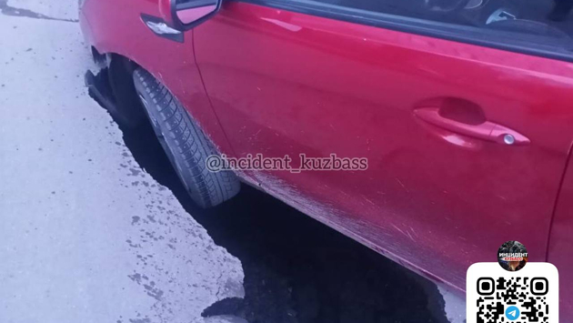 Асфальт провалился под иномаркой в Кемерове, из-за чего транспортное средство одним колесом ушло под землю.