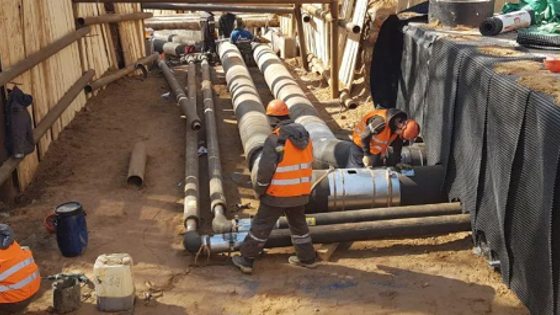 Рабочие монтируют котлован, заливают основание монолитного короба, производят сварочные работы. На участке проложено 630 погонных метров труб из четырех тысяч метров.