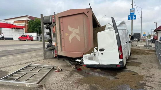 Самосвал, груженый песком, опрокинулся и раздавил фургон под Краснодаром